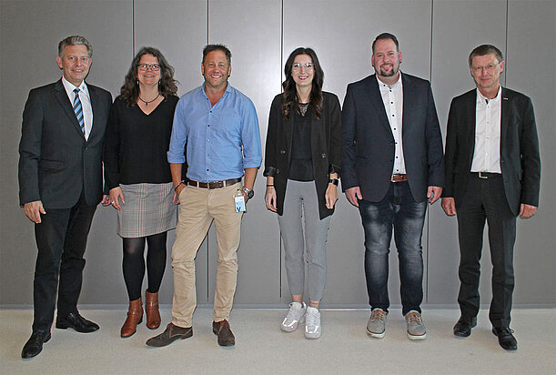 Bild v.l.n.r. Vorsitzender der VTH-Fachgruppe „Klebtechnik” Jan Krückemeyer (Krückemeyer, Wilnsdorf) mit VTH-Geschäftsführerin Nadine Lorenz und dem Vorstand (v.l.n.r.): Thomas Klein (Krückemeyer, Wilnsdorf), Sabrina Bullinger (Rala, Ludwigshafen), David Schlesinger (Wendler, Aue) und Thomas Mahlo (Mrose, Forst/Lausitz). Foto: VTH/Kollaxo